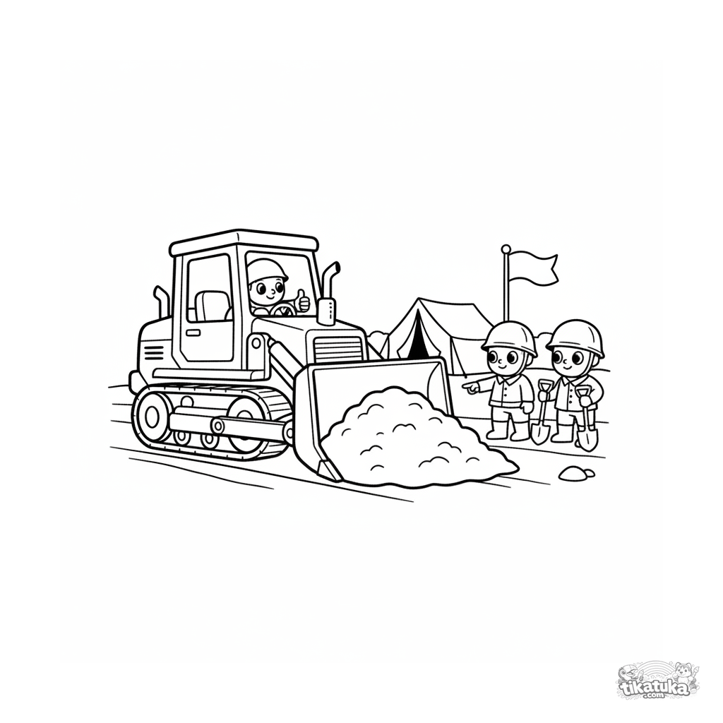 Página para colorear de un bulldózer de ingenieros preparando terreno para carpas. Para niños de 4 a 6 años.