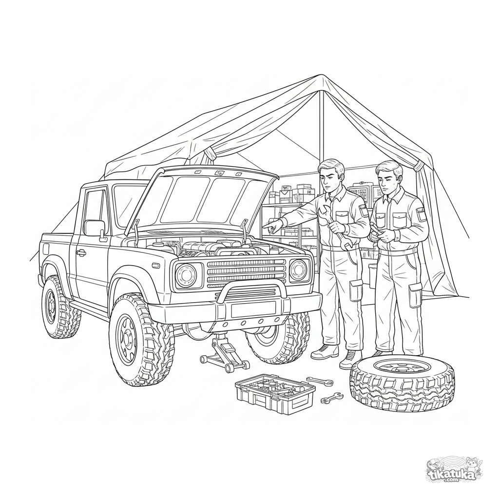 Página para colorear compleja para 10-12 años: ingenieros reparando el motor de un vehículo militar ligero cerca de un taller de campo. Capó abierto, herramientas. Estilo de plano técnico, líneas detalladas.