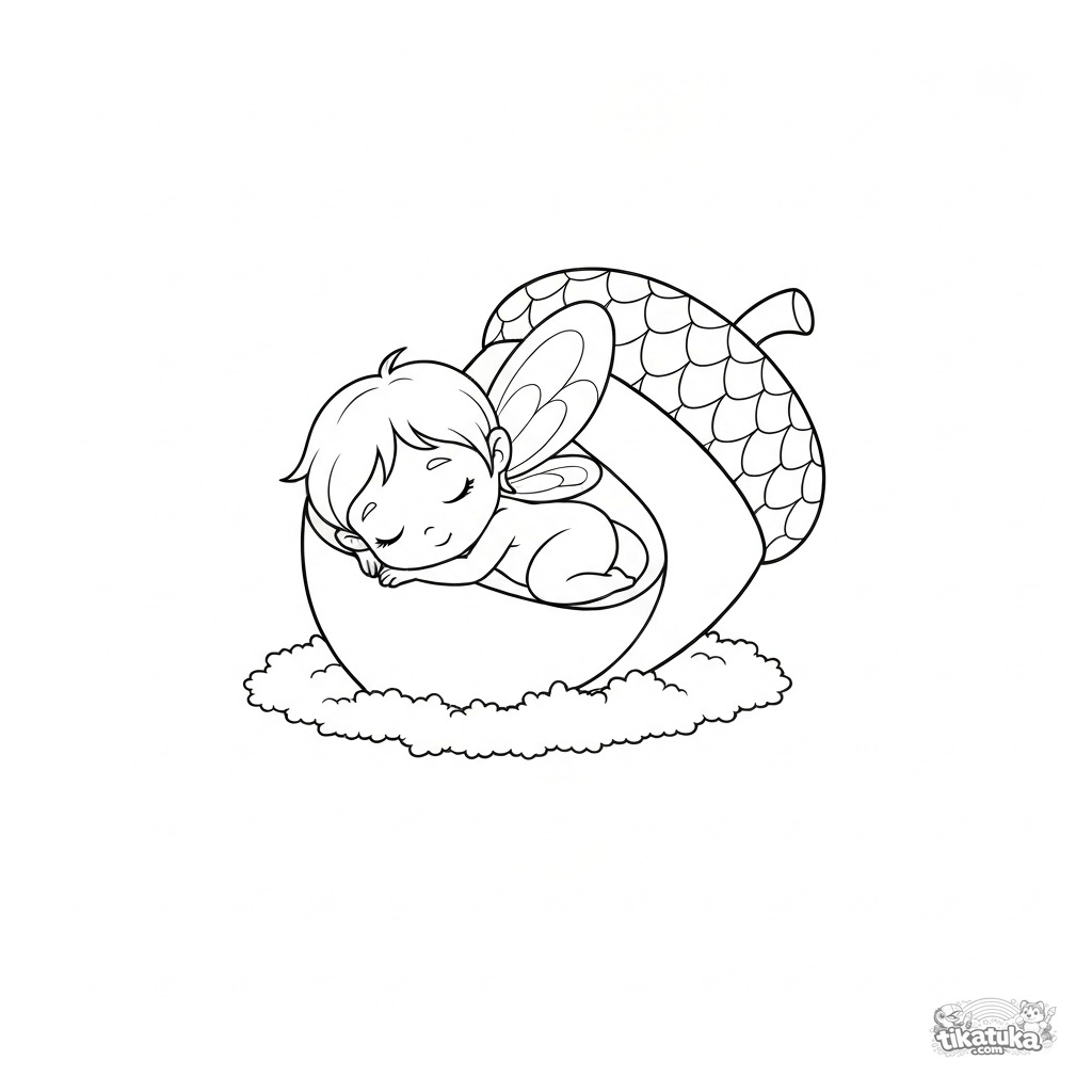 Página para colorear de un hada minúscula profundamente dormida en una cuna acogedora hecha de una bellota hueca. Imagen muy simple y tierna para niños desde 2 años.