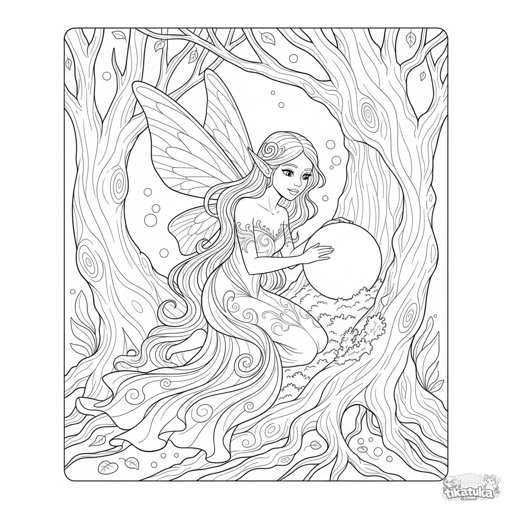 Página para colorear estilo art nouveau para niños mayores 10-12: un hada guardiana pule una piedra lunar dentro de un árbol santuario.