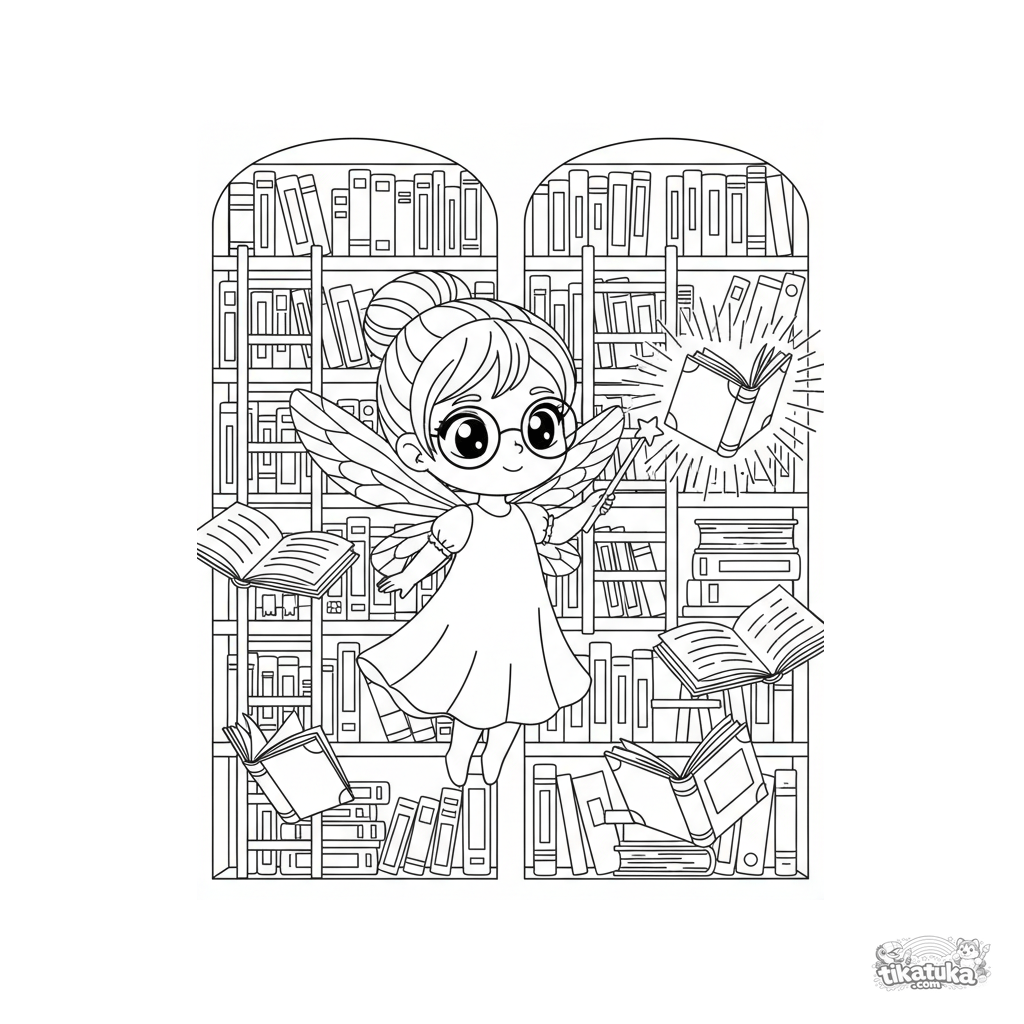 Página para colorear para preadolescentes 7-9: un hada bibliotecaria con gafas organizando libros brillantes y revoloteantes en una vasta biblioteca mágica. Escena de fantasía con detalles.