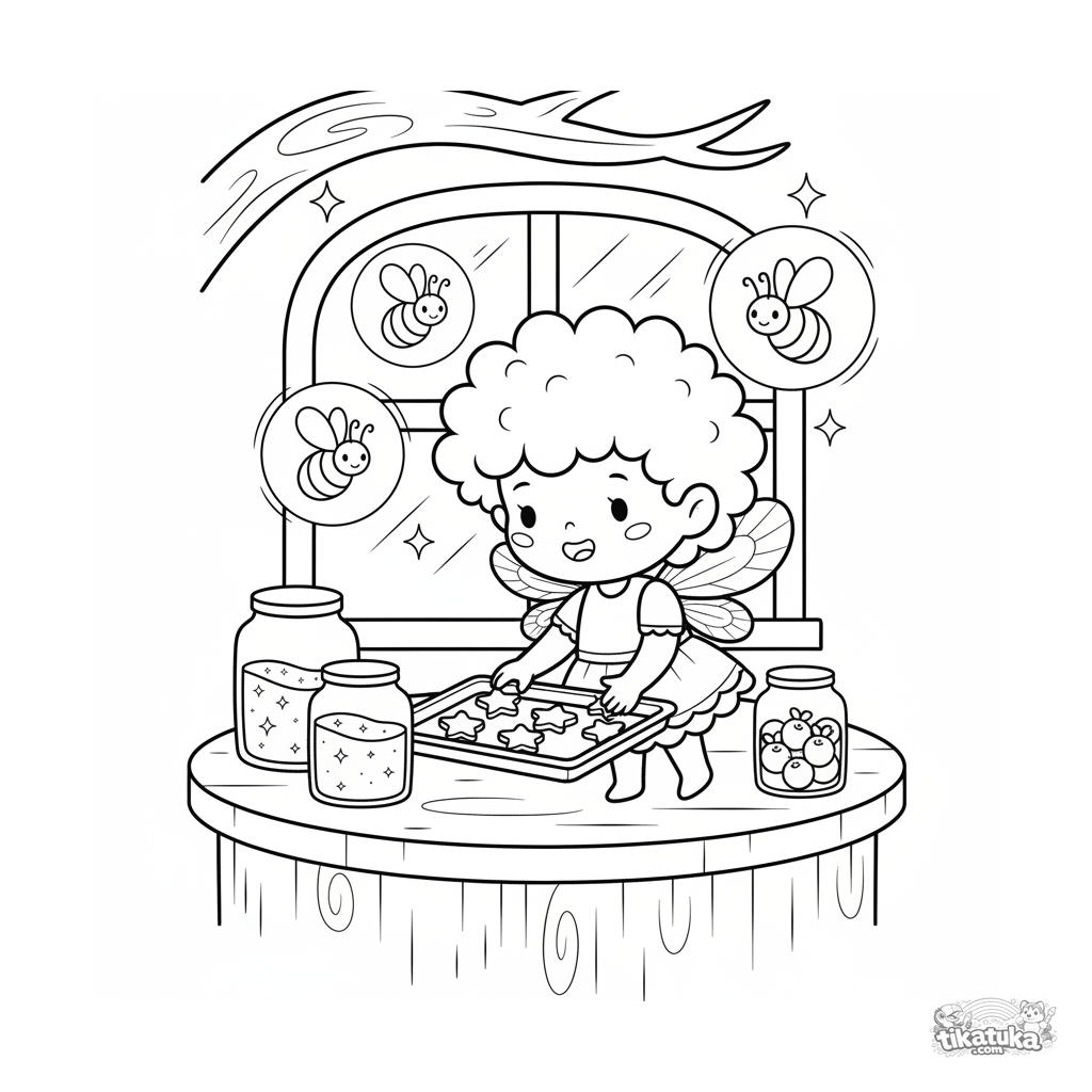 Página para colorear para niños pequeños 2-3: una pequeña princesa hada horneando galletas en la cocina de su casa del árbol. Formas muy grandes, simples y lindas.