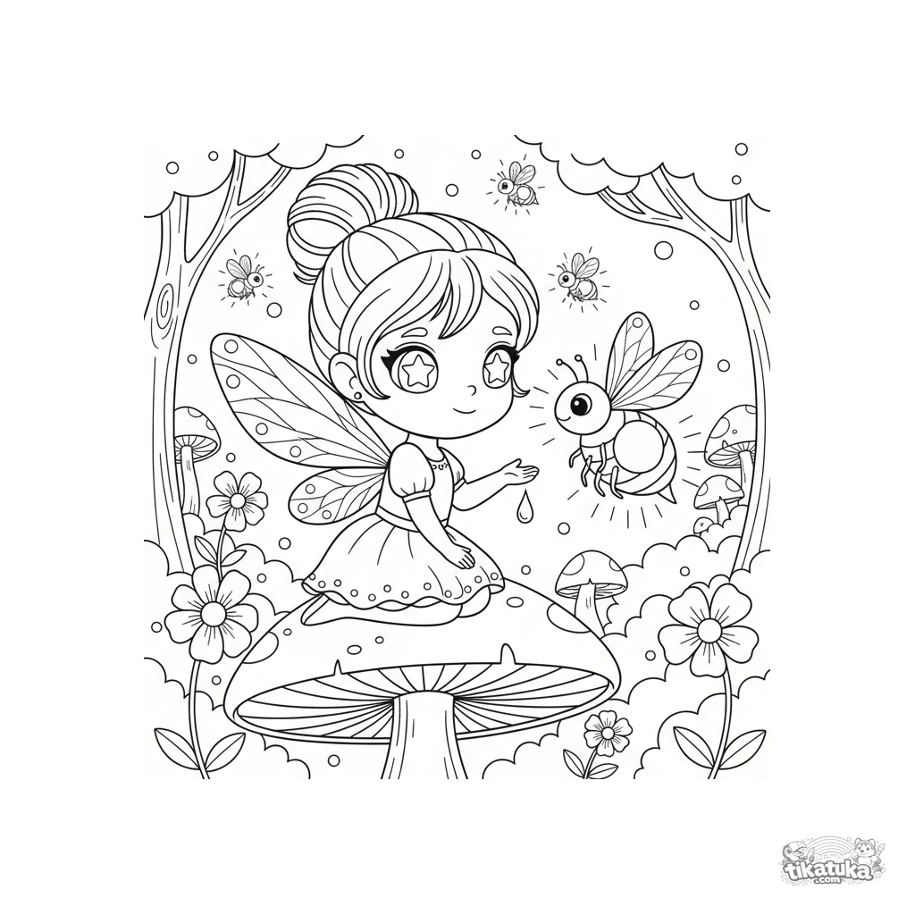 Página para colorear para niños de 4-6 años: una pequeña princesa hada con alas domestica una gran luciérnaga en un hongo en un claro del bosque.