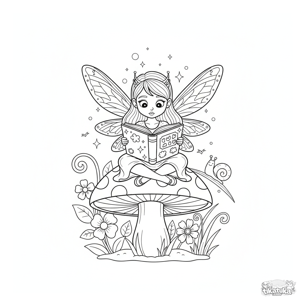 Página para colorear de una princesa hada leyendo un libro de cuentos gigante. Para niñas de 4 a 6 años. Tiene alas brillantes y está sentada en un hongo.