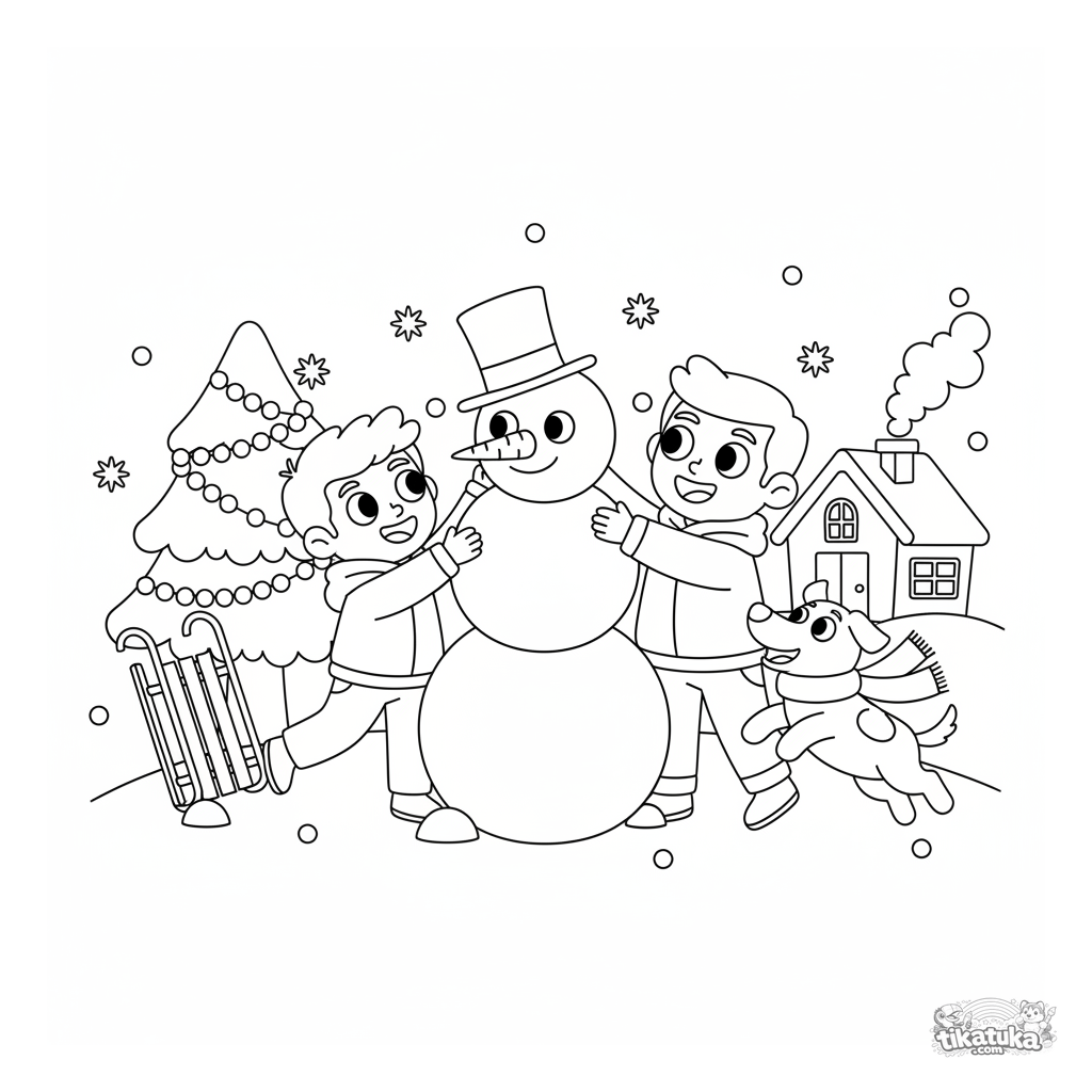 Página para colorear para niños de 4-6 años: una alegre escena invernal donde una familia construye un muñeco de nieve juntos en el patio, nieva, un perro con bufanda juega cerca.