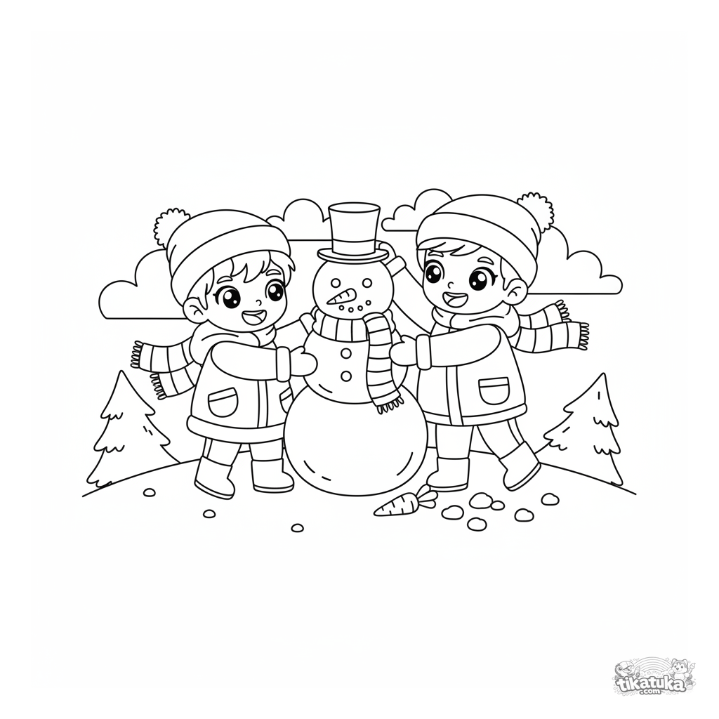 Página para colorear de invierno para niños de 4-6 años: una familia construye un muñeco de nieve en una colina nevada. Escena dinámica y alegre.