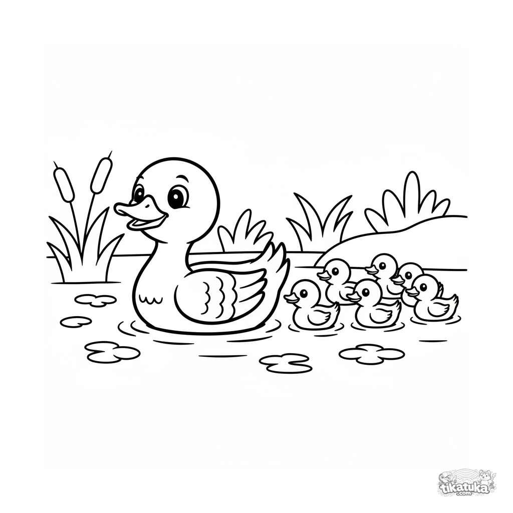 Página para colorear simple para niños pequeños 2-3: una pata madre y patitos esponjosos nadando en fila por un arroyo tranquilo y claro.