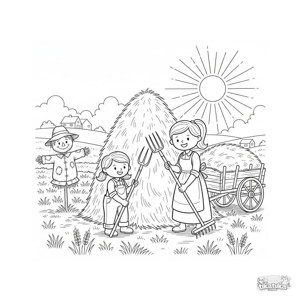 Página para colorear para niños: una familia en ropa de trabajo construye un almiar en un campo cosechado usando horcas y rastrillos.