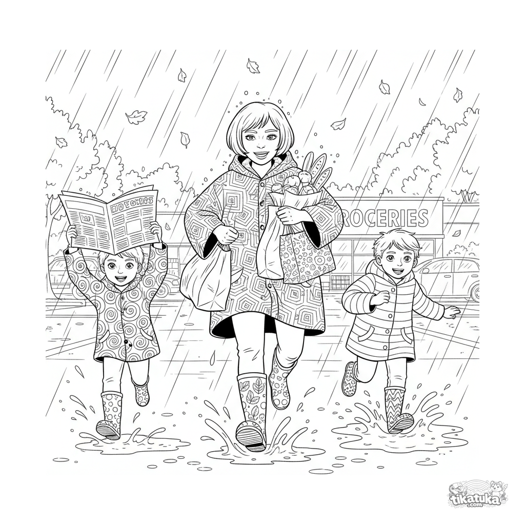 Página para colorear para niños mayores de 10-12 años: una familia con botas de goma corre hacia su coche durante un aguacero de otoño en un aparcamiento.