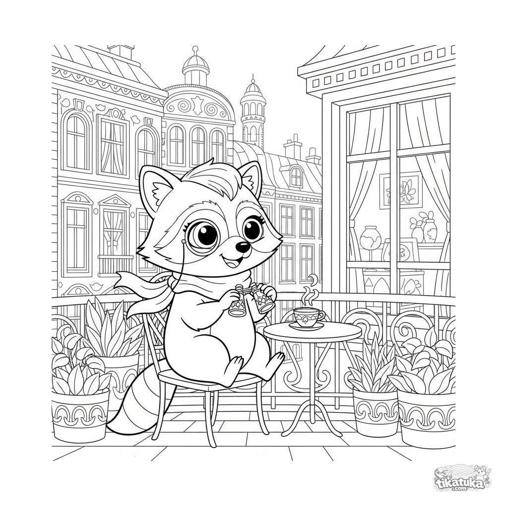 Página para colorear para niños de 10-12 años: un mapache elegante con monóculo en un balcón urbano usa gemelos de ópera para espiar una ventana. Escena de parodia divertida en estilo art nouveau.
