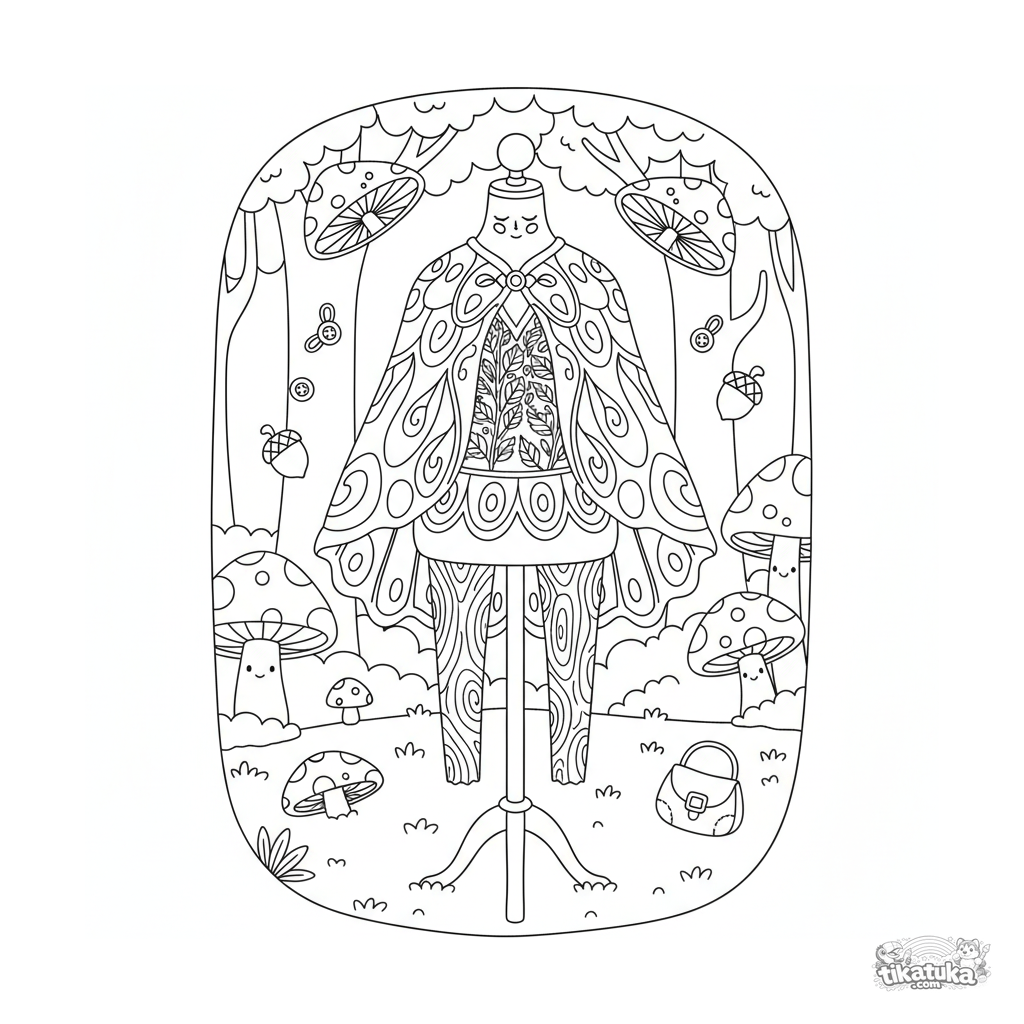 Página para colorear detallada: un atuendo de duende del bosque fantástico en un maniquí en un claro del bosque. Patrones de hojas, accesorios de hongos y bellotas. Para 10-12 años.