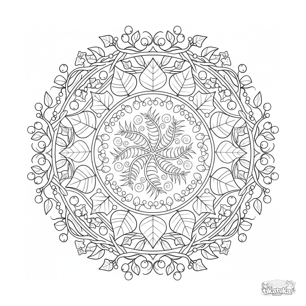 Intrincada página para colorear de mandala botánico para 10-12 años. Compuesta de anillos concéntricos de helechos, hojas de arce, roble y enredaderas con bayas. Alto detalle con venas, tema naturaleza.