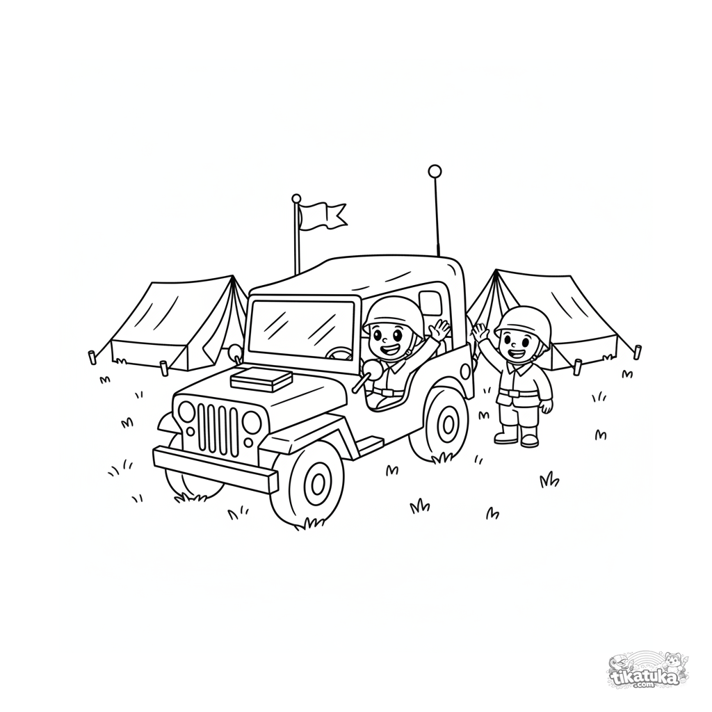 Página para colorear para niños de 4-6 años: un jeep de mando con radio, estacionado cerca del cuartel general de campaña con carpas. Un conductor alegre saluda.