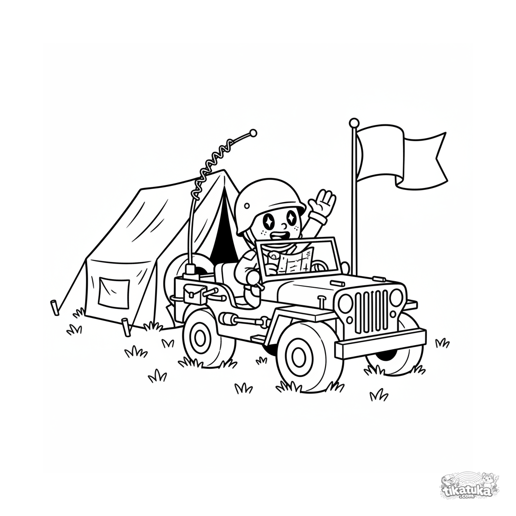 Página para colorear para niños 4-6: un jeep militar de radio estacionado cerca de una carpa de cuartel general de campo. Un soldado alegre saluda desde la ventana.