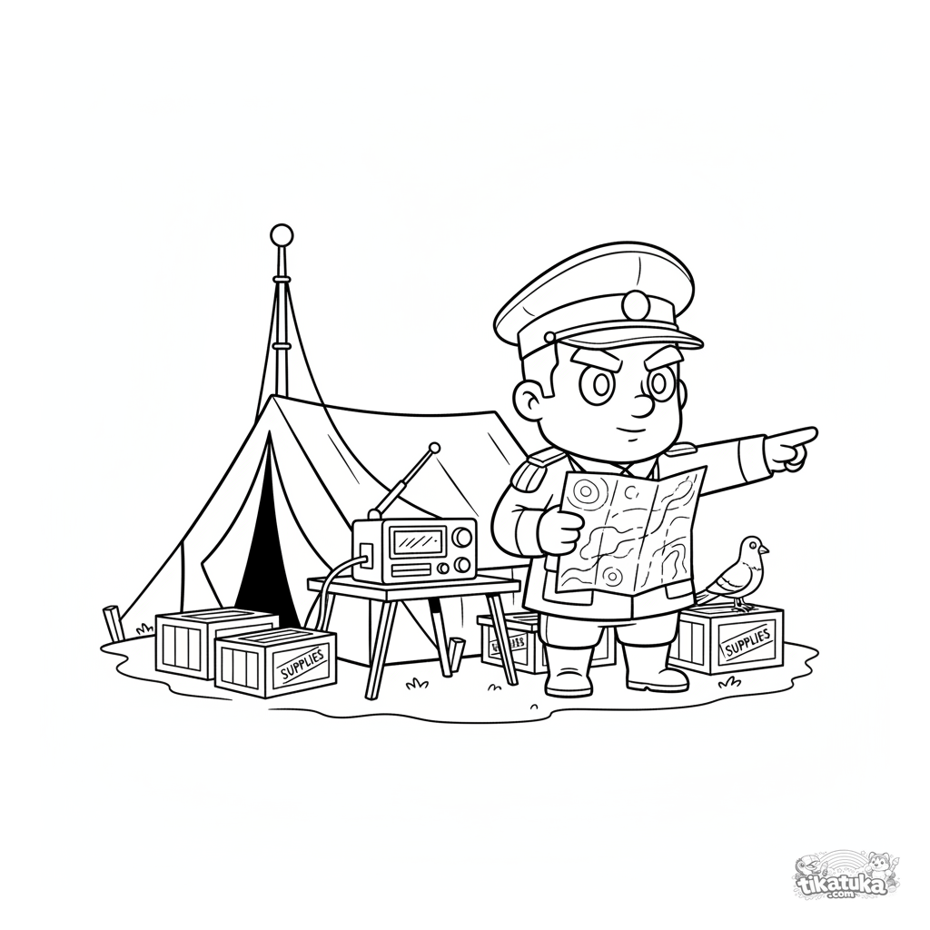 Página para colorear para niños de 7-9 años: un comandante en un cuartel de campaña con tienda de radio. Escena con mapa, cajas y ánimo decidido.