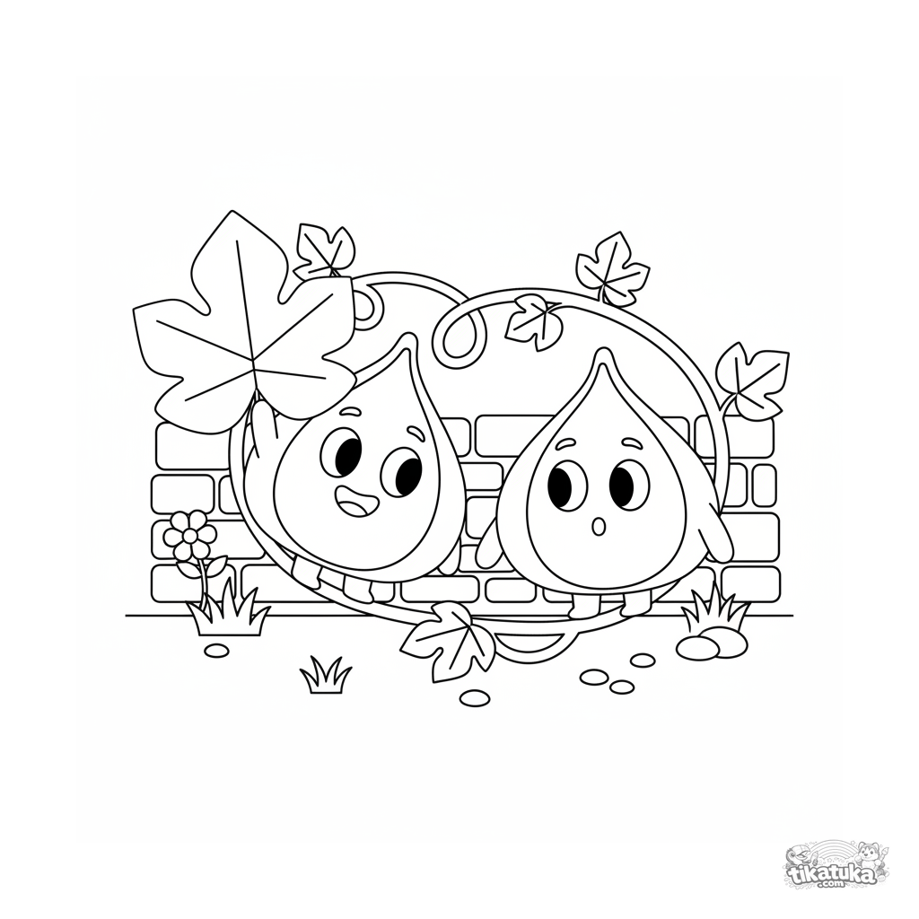 Página para colorear con dos higos en una vid, uno escondido tras una hoja. Para niños de 7-9 años.