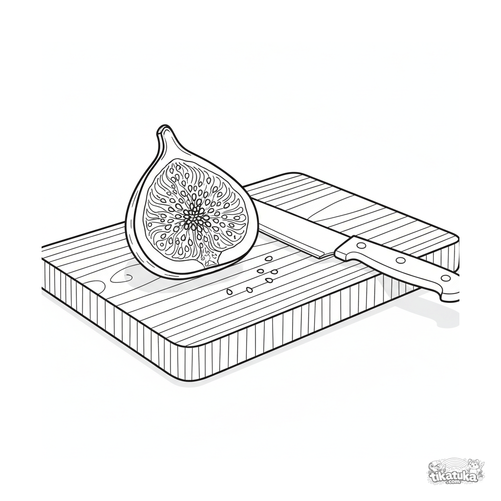 Página para colorear detallada: rodaja de higo en tabla de cortar con cuchillo. Para 10-12 años. Estilo gráfico limpio, enfoque en estructura interna.