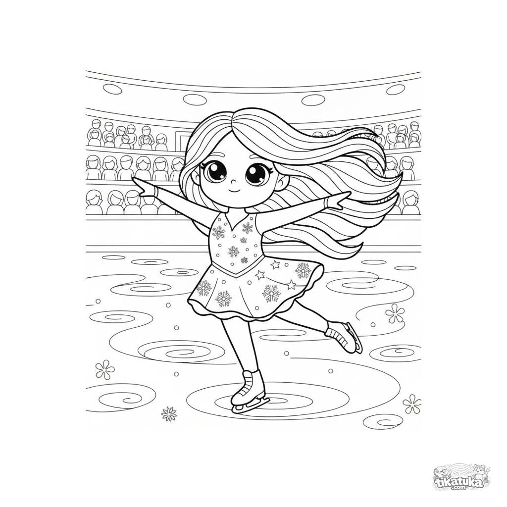Página para colorear detallada para niños 7-12 años: una patinadora artística realiza un giro sobre el hielo. Escena elegante con detalles de vestuario y arena.