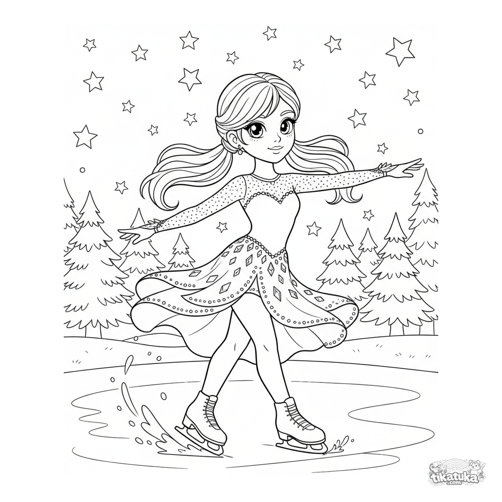 Página compleja para colorear para niñas 10-12: patinadora artística en vestido detallado girando sobre hielo, con efectos de spray y fondo de bosque invernal.