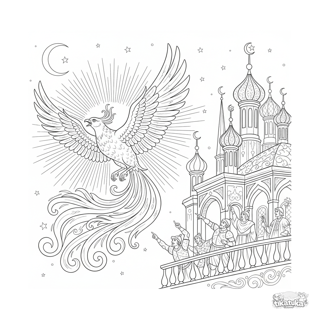 Página para colorear con el Ave Fénix volando sobre el palacio del zar en el cielo nocturno. Para niños mayores de 7-12 años. Escena detallada y mágica de un cuento ruso.