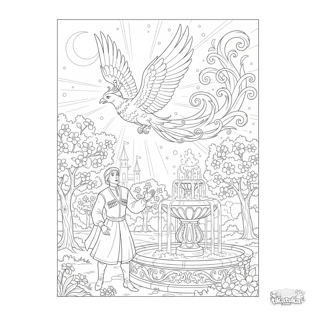 Página para colorear del Ave de Fuego volando sobre un jardín real a la luz de la luna. Para 7-12 años. Escena detallada con fuente, manzanos y príncipe.