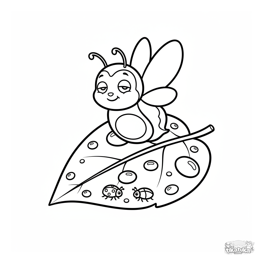 Página simple para colorear para niños pequeños 2-3: una luciérnaga en estilo marioneta suave brilla como una linterna sobre una hoja con rocío. Formas muy simples.