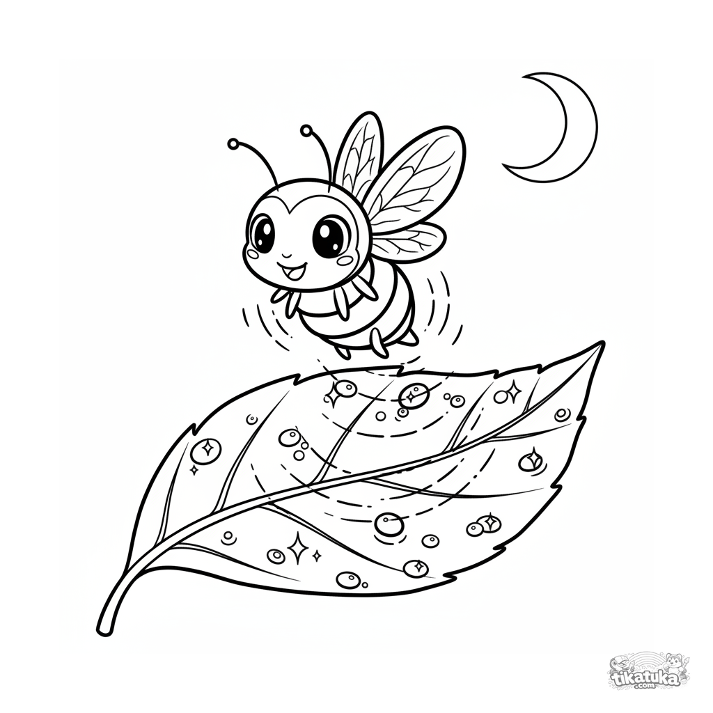 Página para colorear para niños de 4-6 años: una luciérnaga amigable ilumina una hoja con rocío por la noche. Estilo anime kodomo, ojos grandes expresivos, escena nocturna mágica.