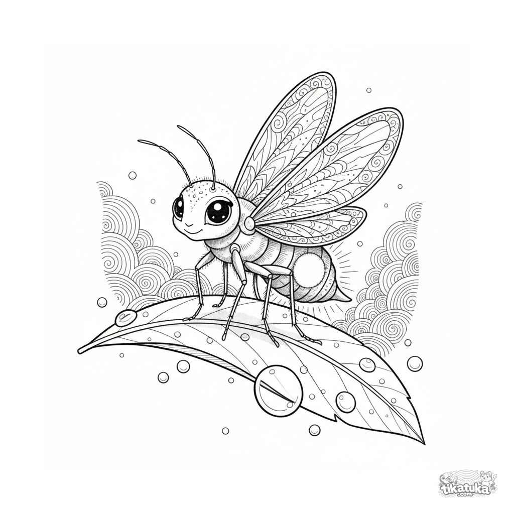 Página para colorear detallada para niños mayores de 10-12 años: una luciérnaga brilla en una hoja con rocío al anochecer.
