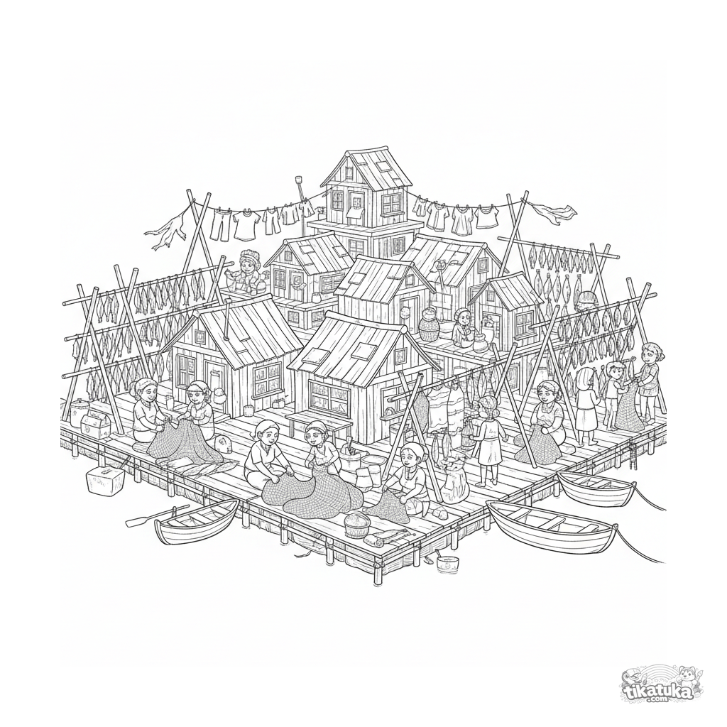 Página para colorear detallada de una aldea flotante de pescadores en una gran plataforma en el mar para 10-12 años. Incluye cabañas, pescado secándose, pescadores arreglando redes y tendederos.