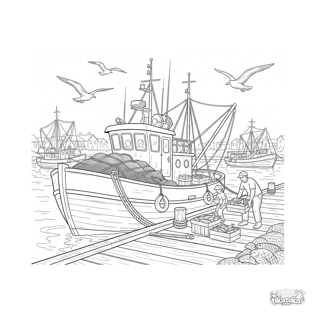 Página para colorear para preadolescentes 7-9 años: un arrastrero descarga su pesca en un muelle concurrido. Estilo urban-sketch.