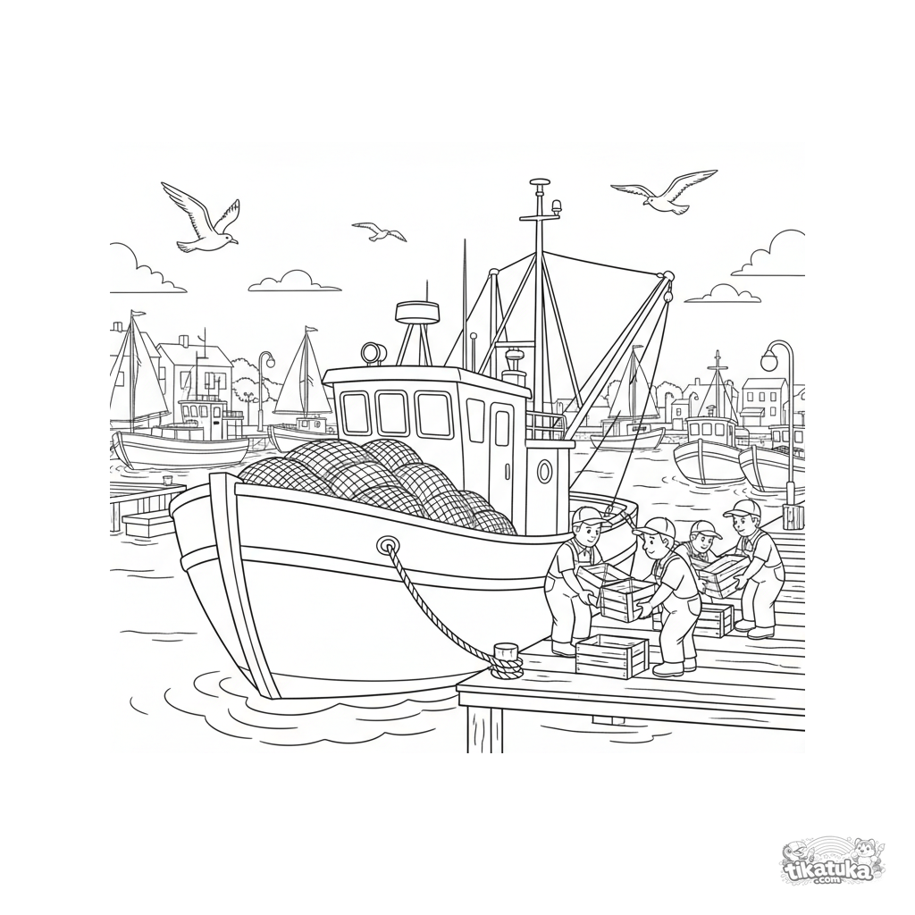 Página para colorear para niños de 7 a 9 años: un arrastrero descarga su pesca en un muelle al atardecer. Ambiente de trabajo, gaviotas.