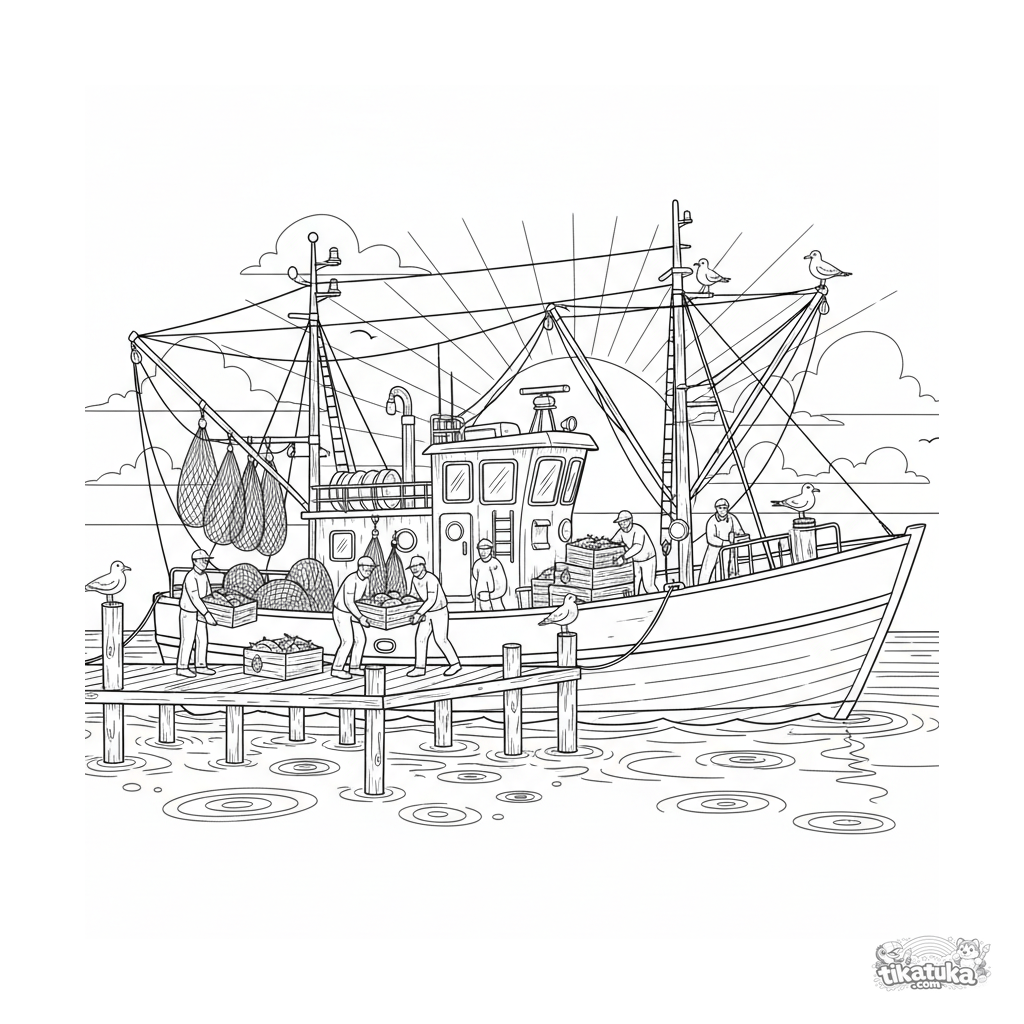 Página para colorear detallada para niños mayores de 10-12 años: un arrastrero descarga la pesca en un muelle al atardecer. Tripulantes, cajas, redes y gaviotas.