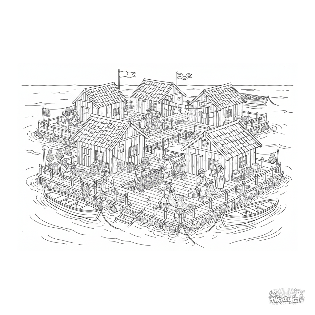 Página para colorear: un detallado pueblo pesquero con casas en plataformas flotantes en el mar para niños de 10-12 años. Con pasarelas, barcos, redes secándose y aldeanos trabajando.