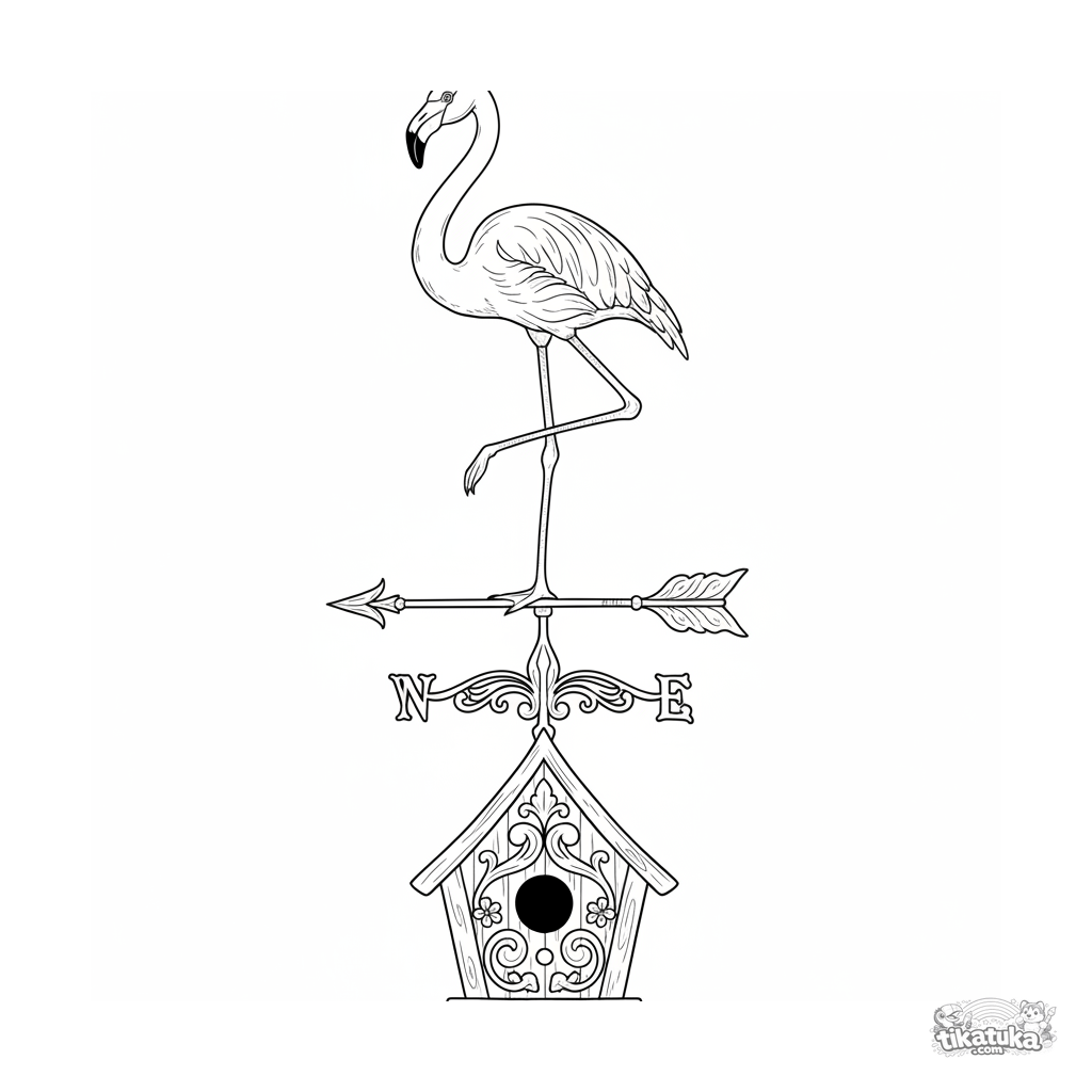 Página para colorear elegante para 10-12 años en estilo art nouveau: un flamenco elegante se equilibra en la veleta de una pajarera. Líneas fluidas.