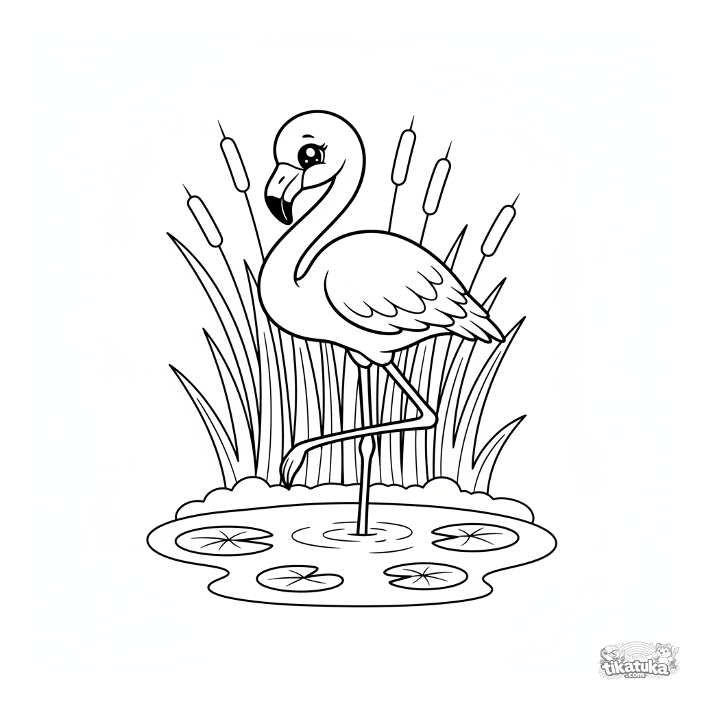 Página para colorear: un flamenco descansando en una pata al borde de un estanque. Para niños de 4 a 6 años, escena tranquila.