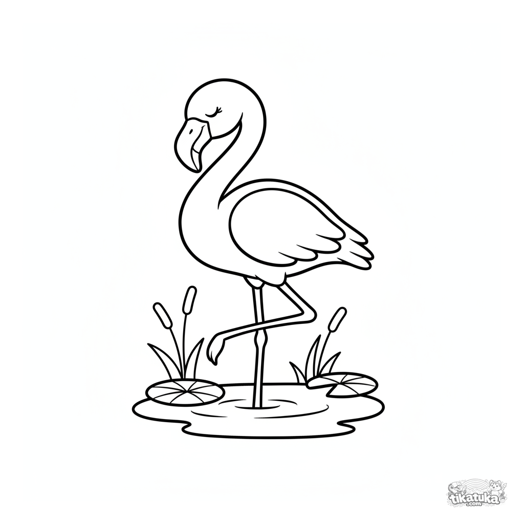 Página simple para colorear para niños pequeños de 2-3 años: un flamenco parado en una pata junto a un estanque, durmiendo.