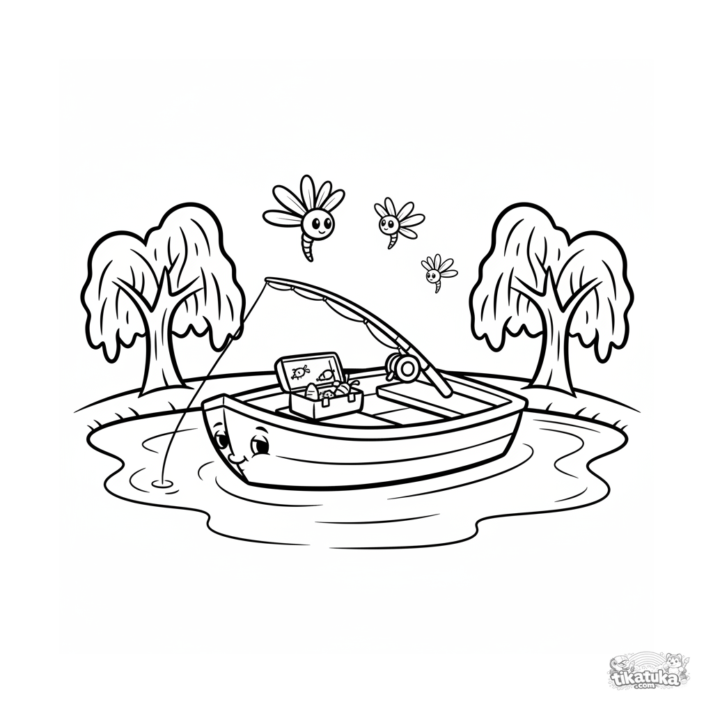 Página simple para colorear para niños pequeños: un bote de fondo plano está en un estanque tranquilo. Caña de pescar, caja de aparejos.