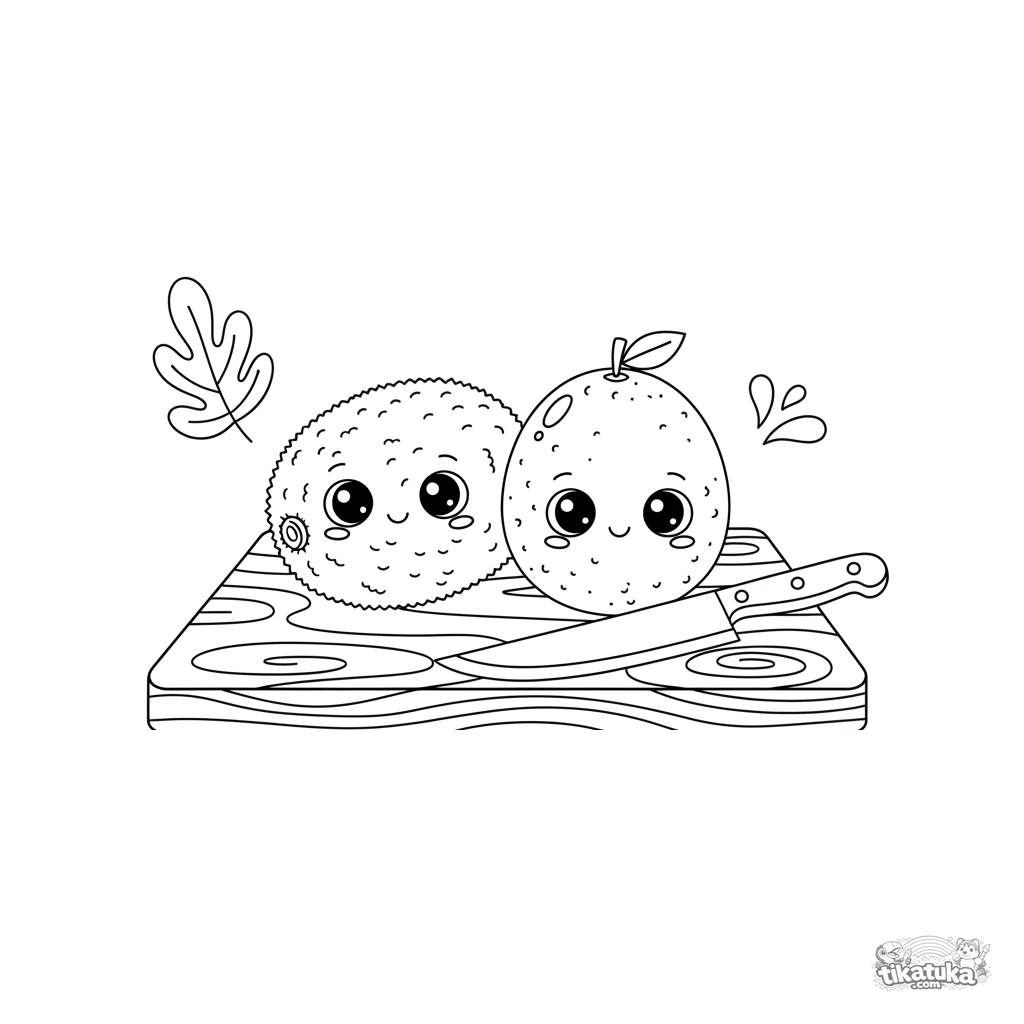 Página para colorear para niños 7-9: una ilustración gráfica moderna de un kiwi y una maracuyá en una tabla. Contornos limpios, diseño plano.