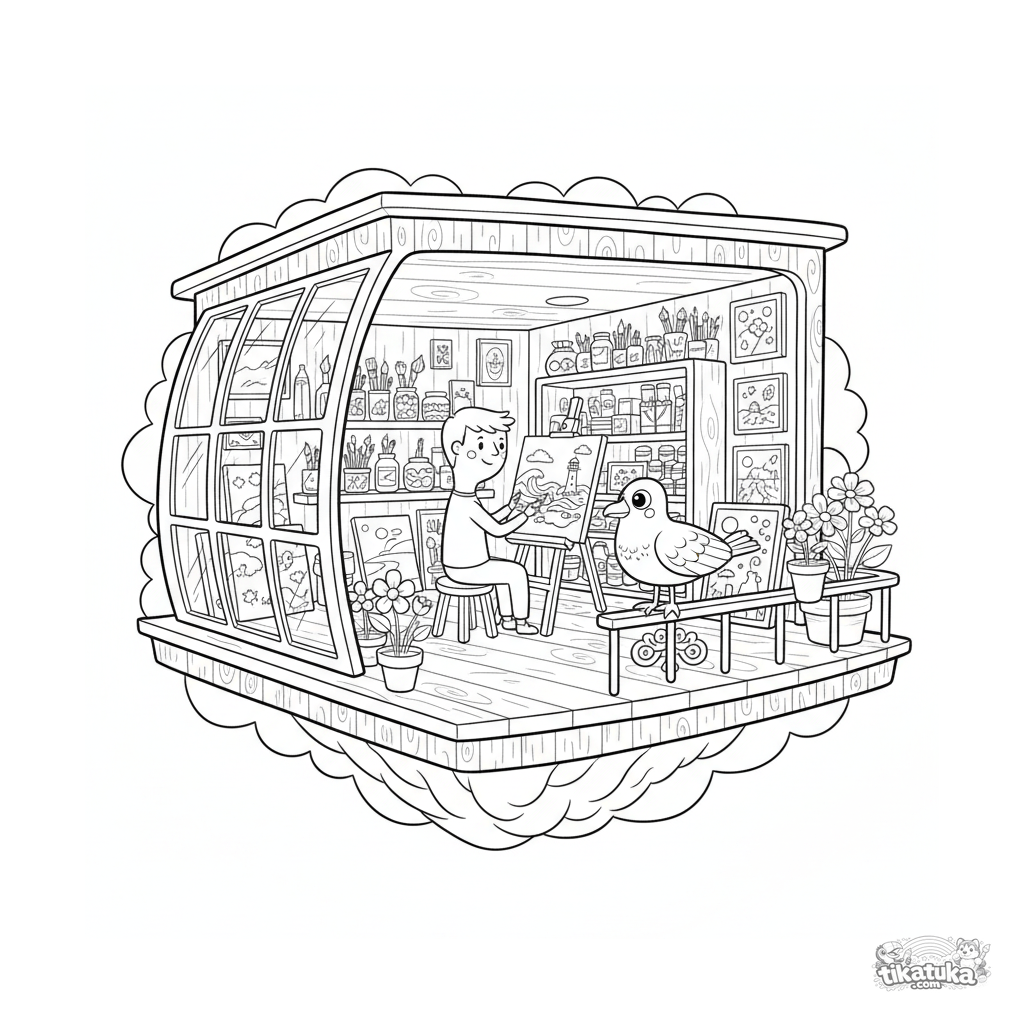 Página para colorear: un estudio de arte flotante en una amplia plataforma marina para niños de 10-12 años. Artista en caballete, pinceles, pinturas, lienzos y vista al mar.