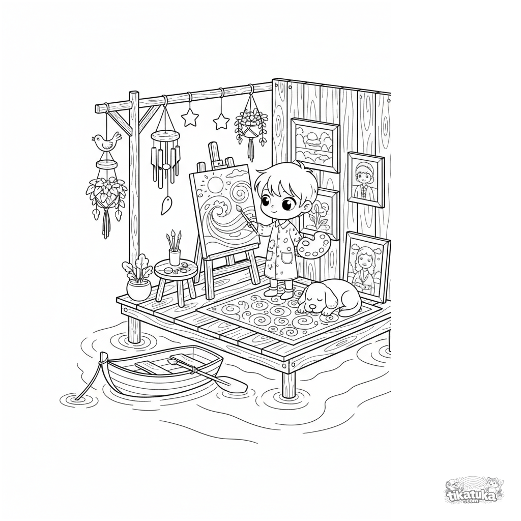 Página para colorear detallada para niños de 10 a 12 años: un estudio de artista flotante creativo en una plataforma de madera. Artista en caballete, pinturas, paleta, perro y una vista marina pacífica.