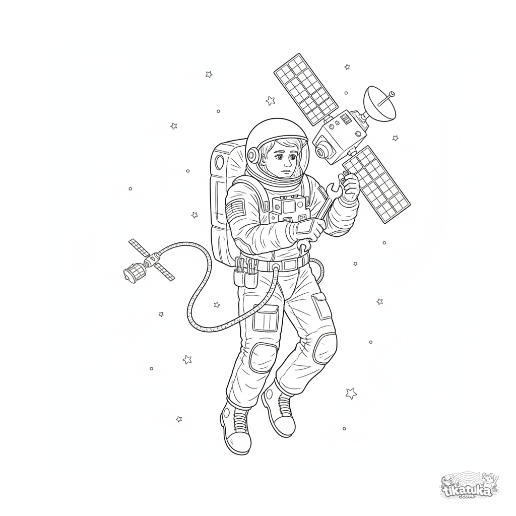Página para colorear para 10-12 años: un astronauta flotando en el espacio exterior repara un satélite entre estrellas. Traje espacial y herramientas detalladas.