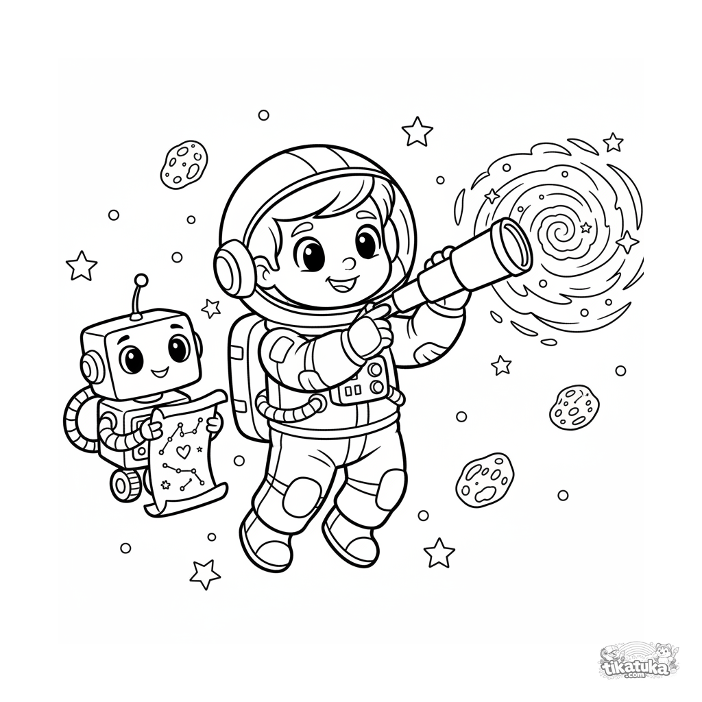 Página para colorear para niños de 4-6 años: un astronauta con un telescopio y un robot compañero flotando entre estrellas en el espacio exterior. Líneas simples y claras.