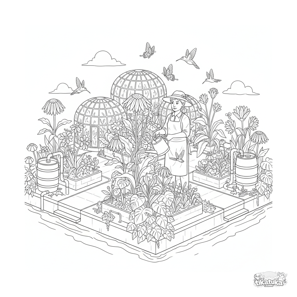 Página para colorear de un jardín botánico flotante detallado para 10-12 años. Imagen con invernaderos, senderos, jardinero y mariposas.