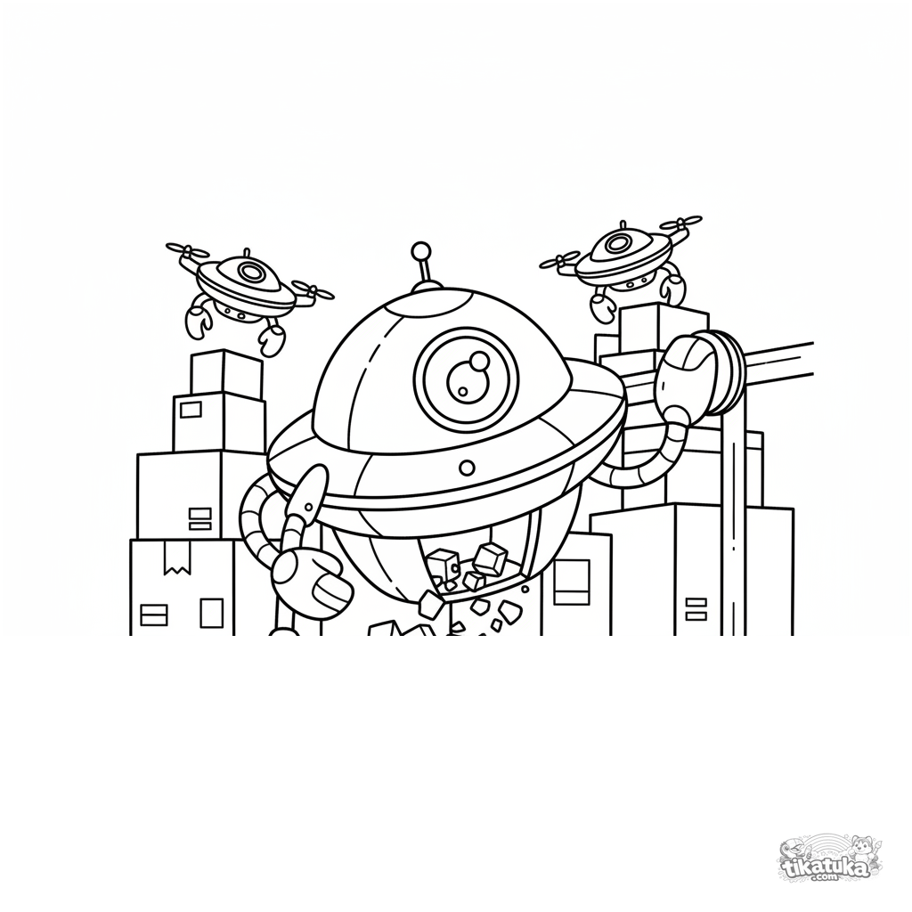 Página para colorear para niños 4-6: un robot conserje flotante ordenando un almacén. Formas geométricas, escena clara con acción.