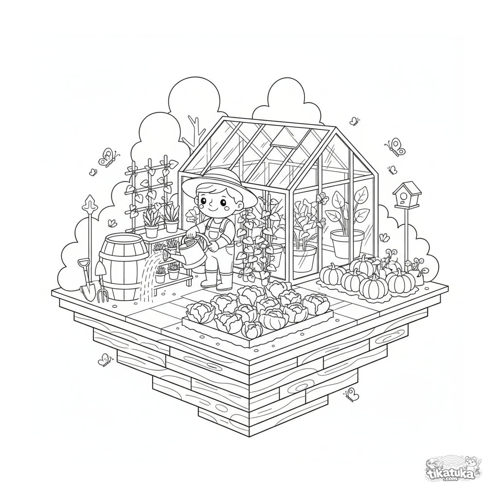 Página para colorear para 10-12 años: un jardín flotante con invernadero y camas de vegetales en una plataforma resistente en el mar. Un jardinero riega plantas, mariposas y un barril de lluvia cerca.