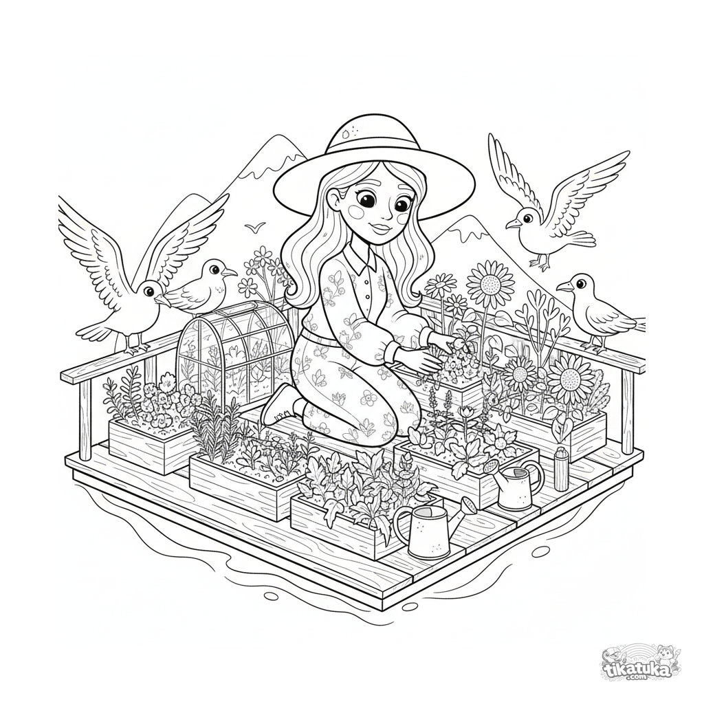Página para colorear para 10-12 años: un botánico cuida un jardín en una plataforma flotante en el mar. Escena detallada con camas de plantas, invernadero y pájaros.