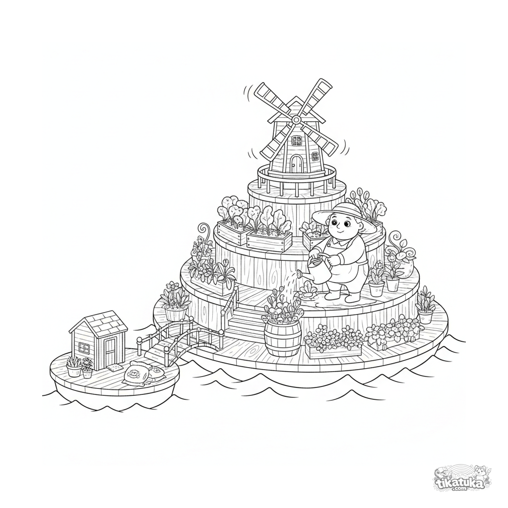 Página para colorear de un jardín flotante acogedor con molino en plataforma marina para 10-12 años. Detalles: bancales, macetas, jardinero con regadera, puente de cuerda.