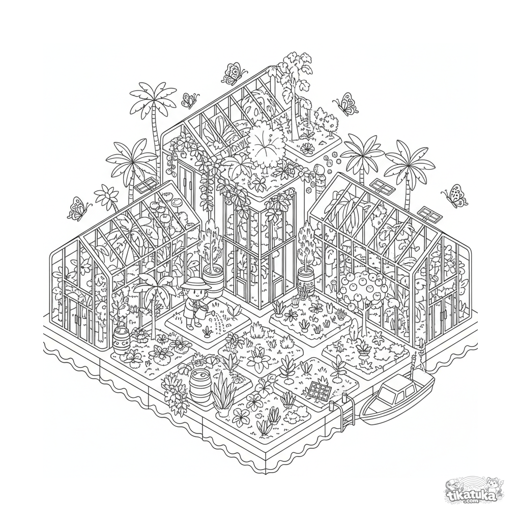 Página para colorear para 10-12 años: un invernadero flotante complejo con plantas exóticas en un mar tropical. Botánico, techos de cristal, mariposas y paneles solares.