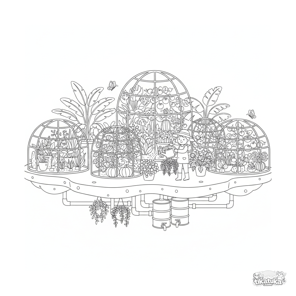 Página detallada para colorear de un invernadero flotante con plantas para 10-12 años. Escena con cúpulas, jardinero y mariposas.