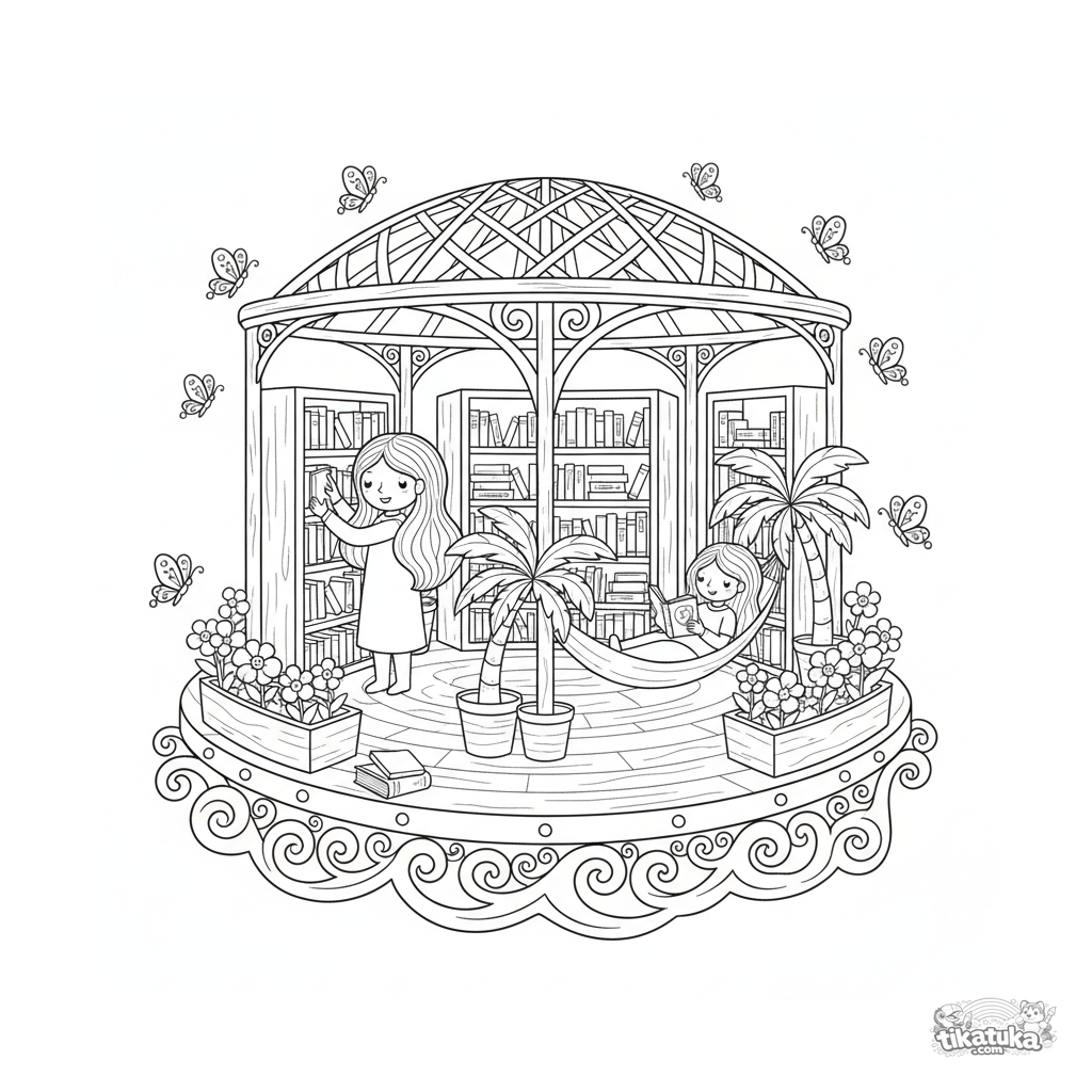 Página para colorear para 10-12 años: una plataforma flotante caprichosa diseñada como biblioteca y jardín. Estanterías, hamaca, palmeras en macetas y un mar sereno.